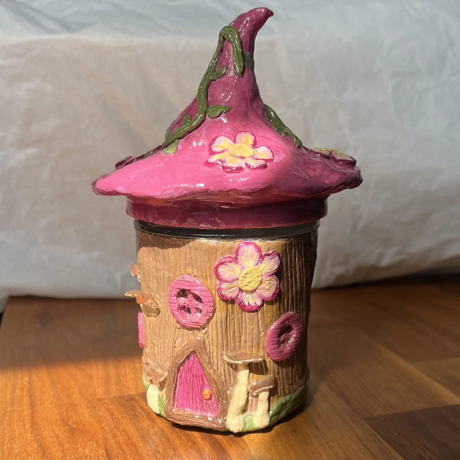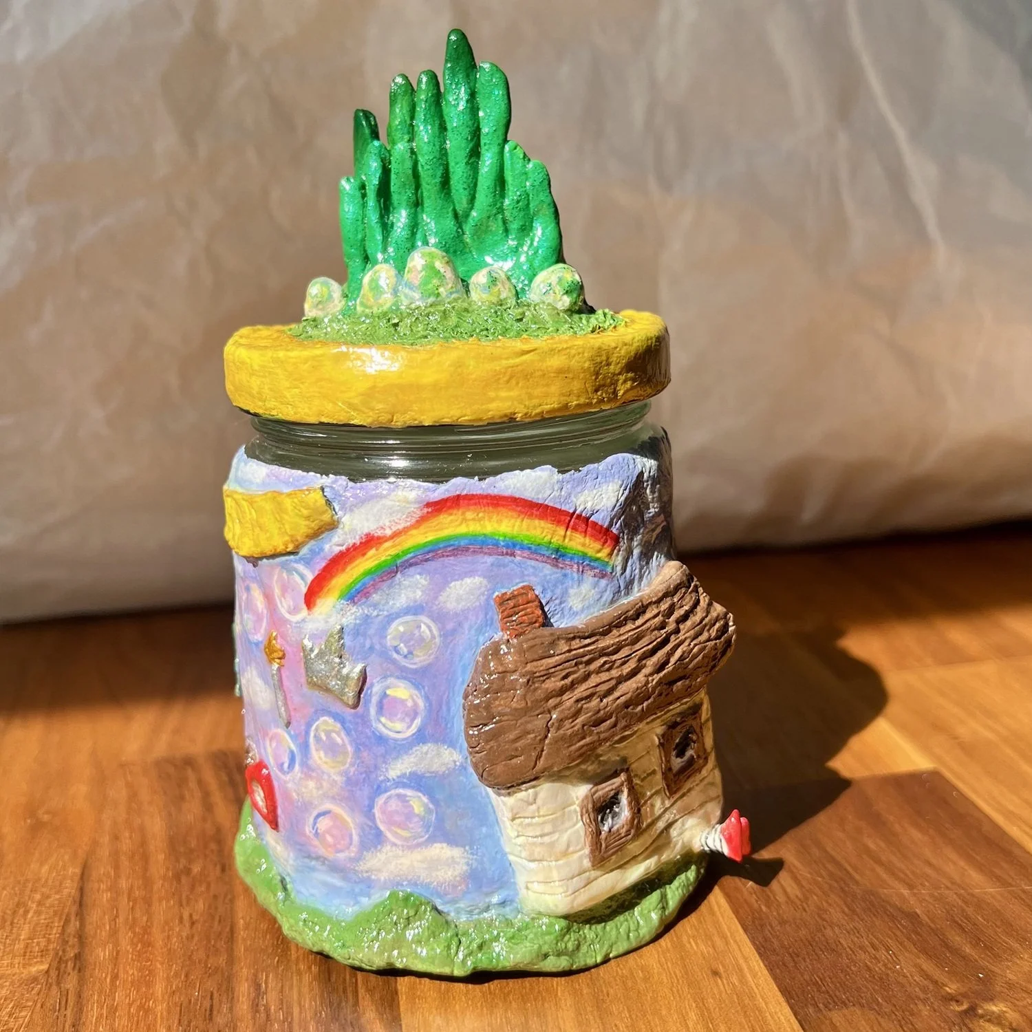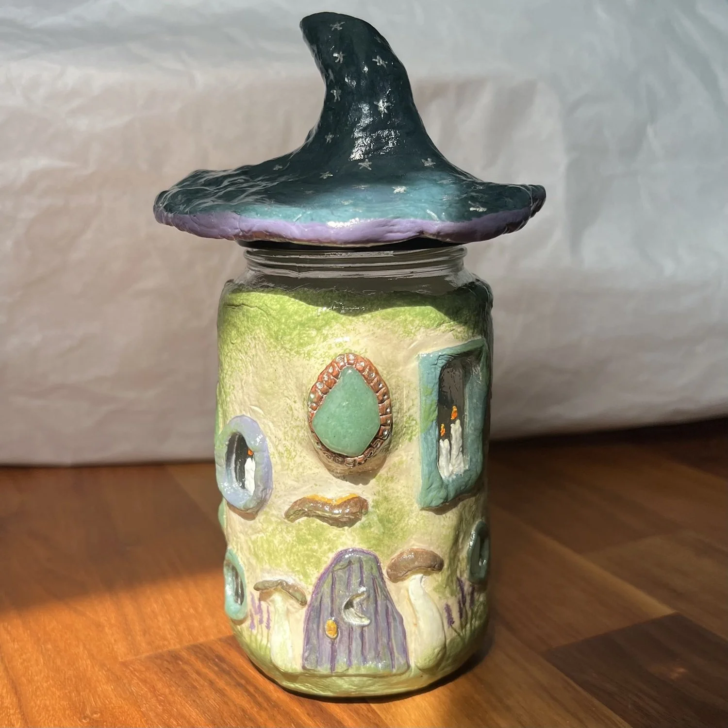 Transforming jars into fairy homes that would otherwise be thrown away into decorative stash jars where you can store your trinkets or herbs. For extra magic consider adding a LED light inside to look like fairies are having a lively party within their little home.